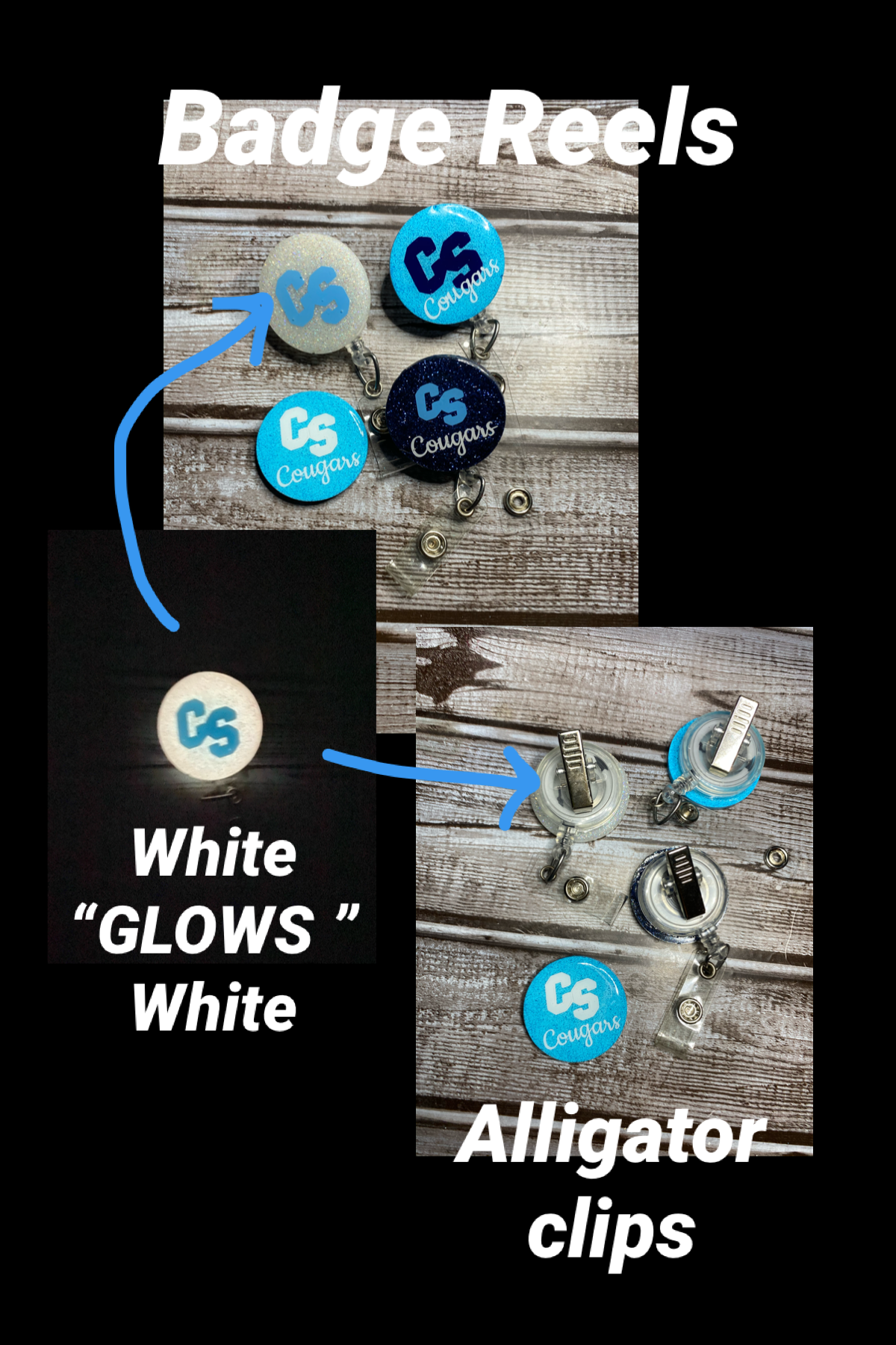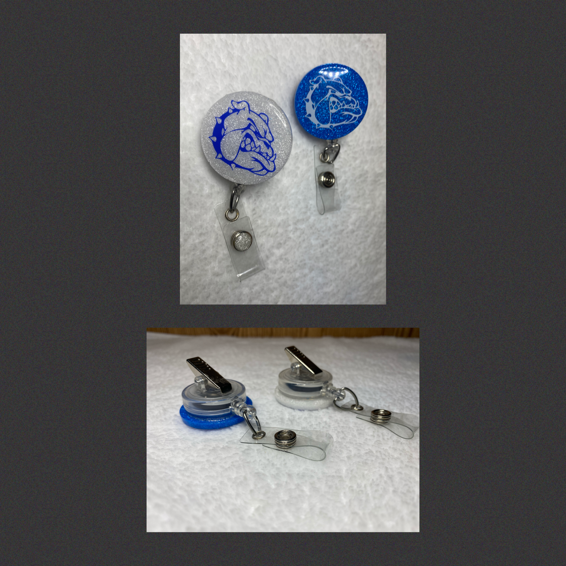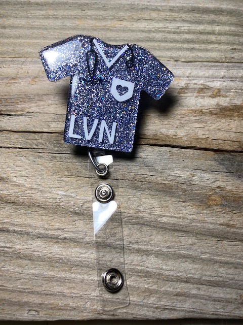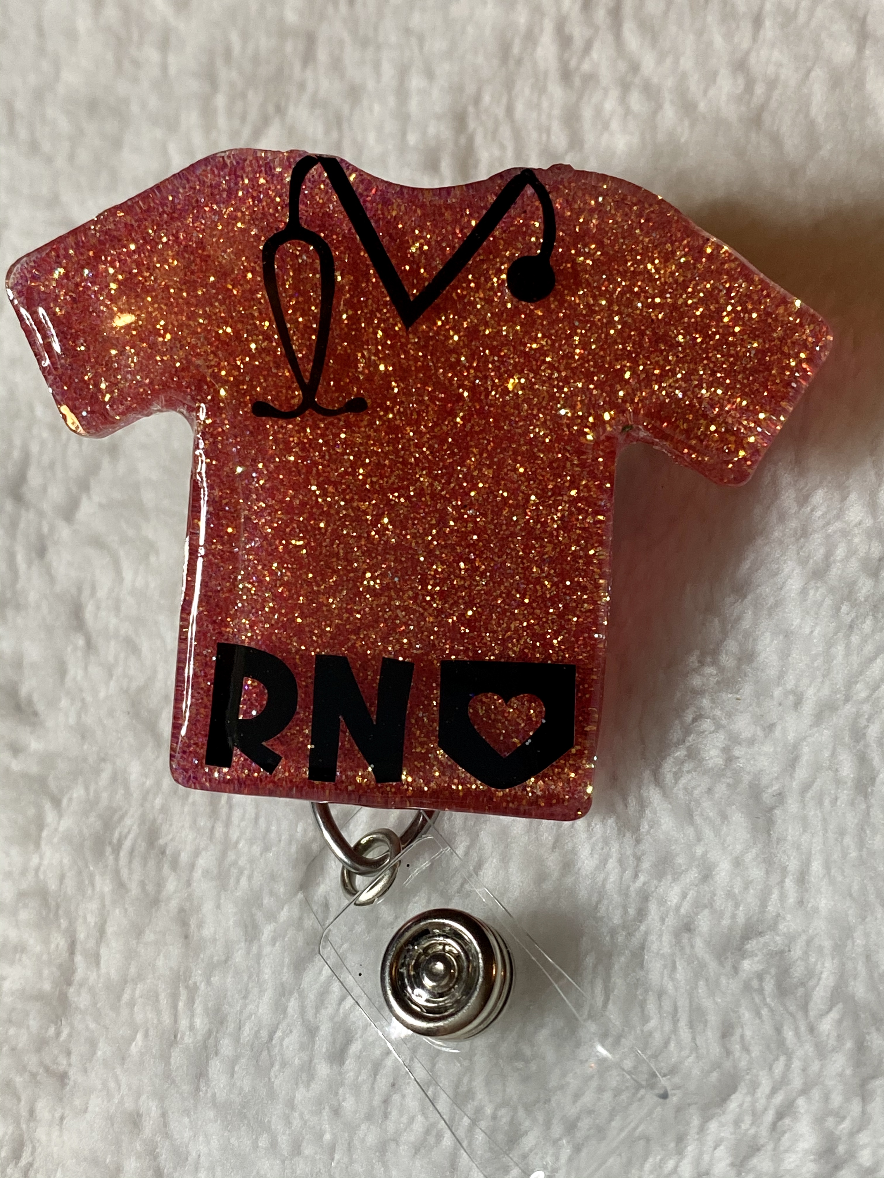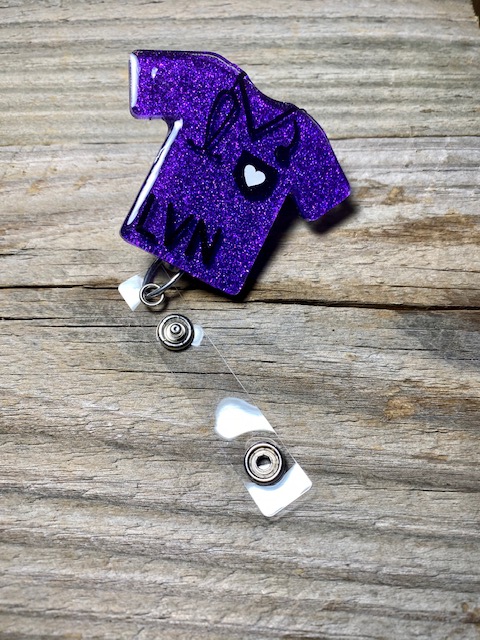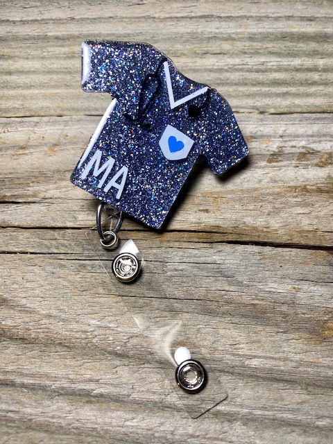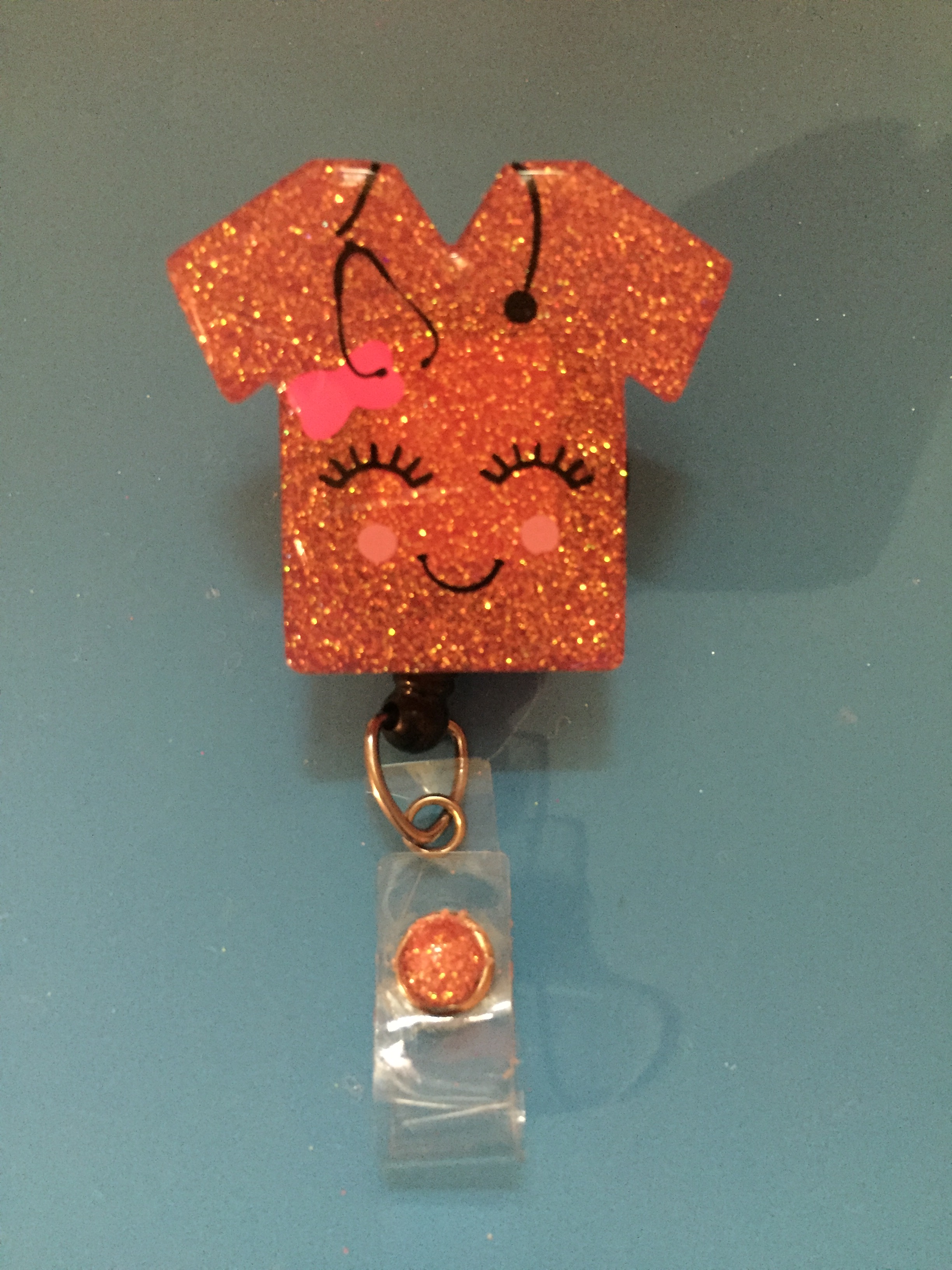 We offer all kinds of fun themes that includes holidays, sports, hobbies, and almost most medical fields. You can choose from many beautiful glitters or non glitter (powder) colors. The badge reels we use are the swivel retractable alligator clip reel and they are suppose to last up to 100,000+ pulls. You have the option to have them be interchangeable (with a low profile heavy duty Velcro) or to have them be permanently attached with E6000 adhesive to the reel.