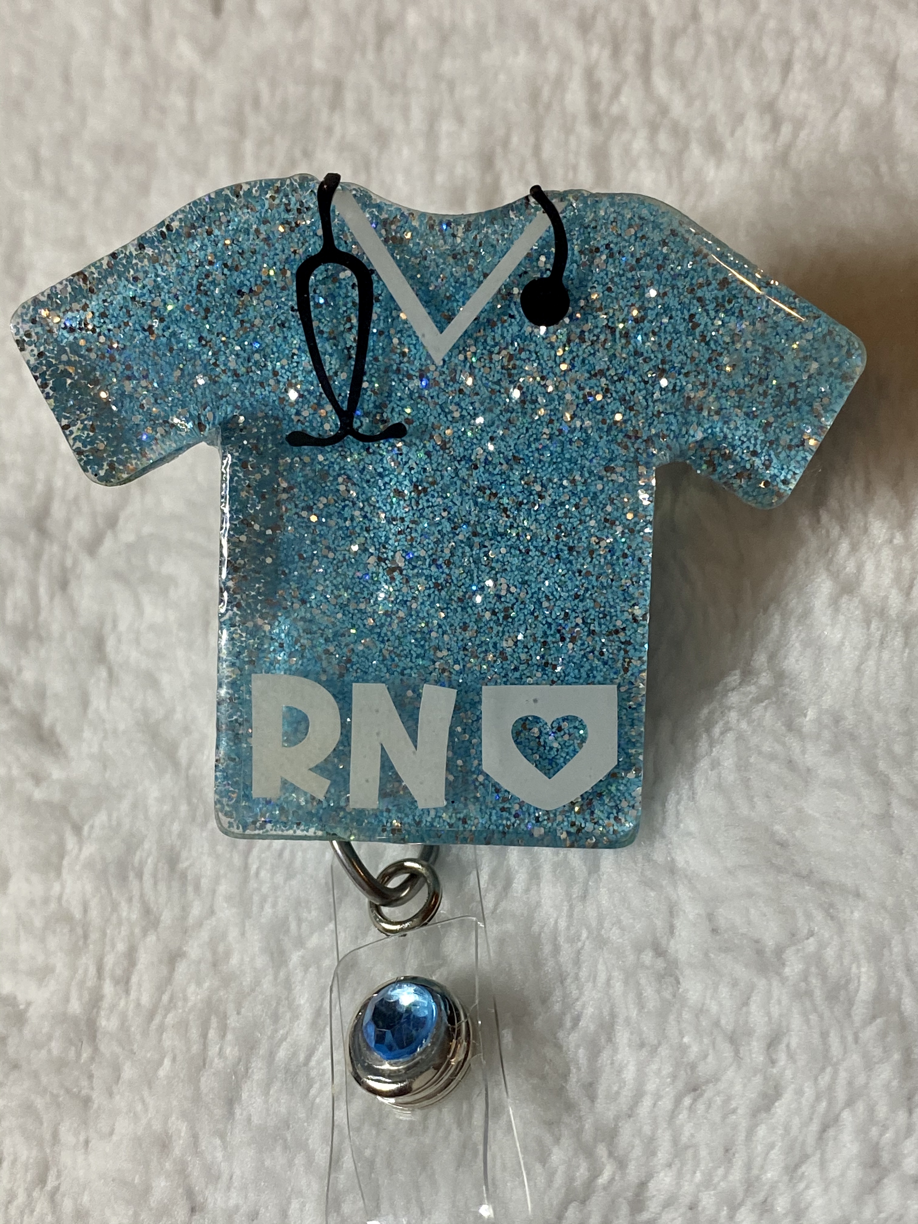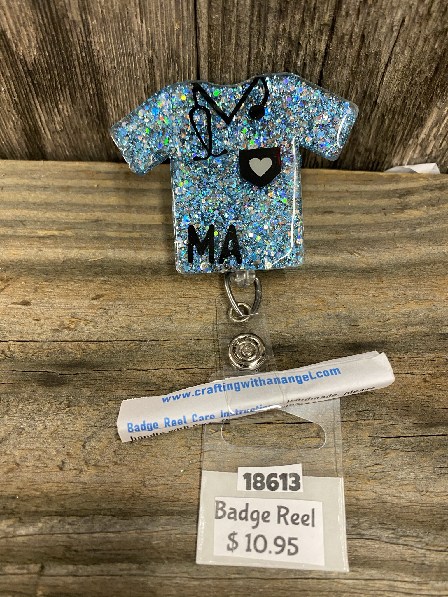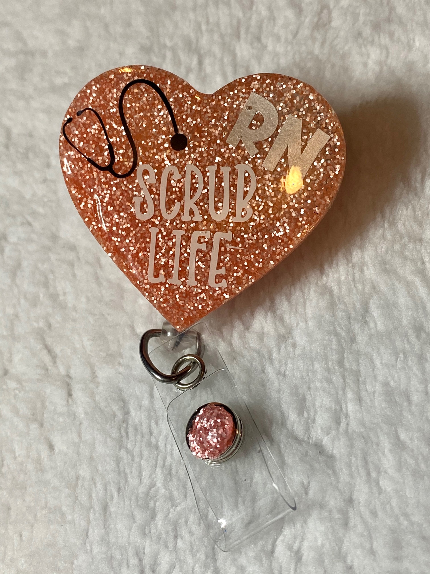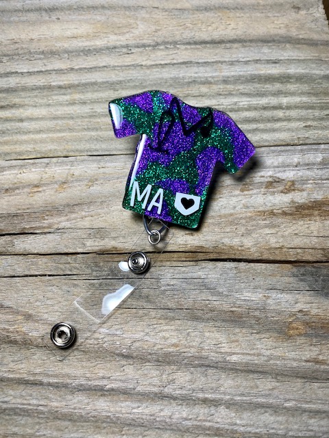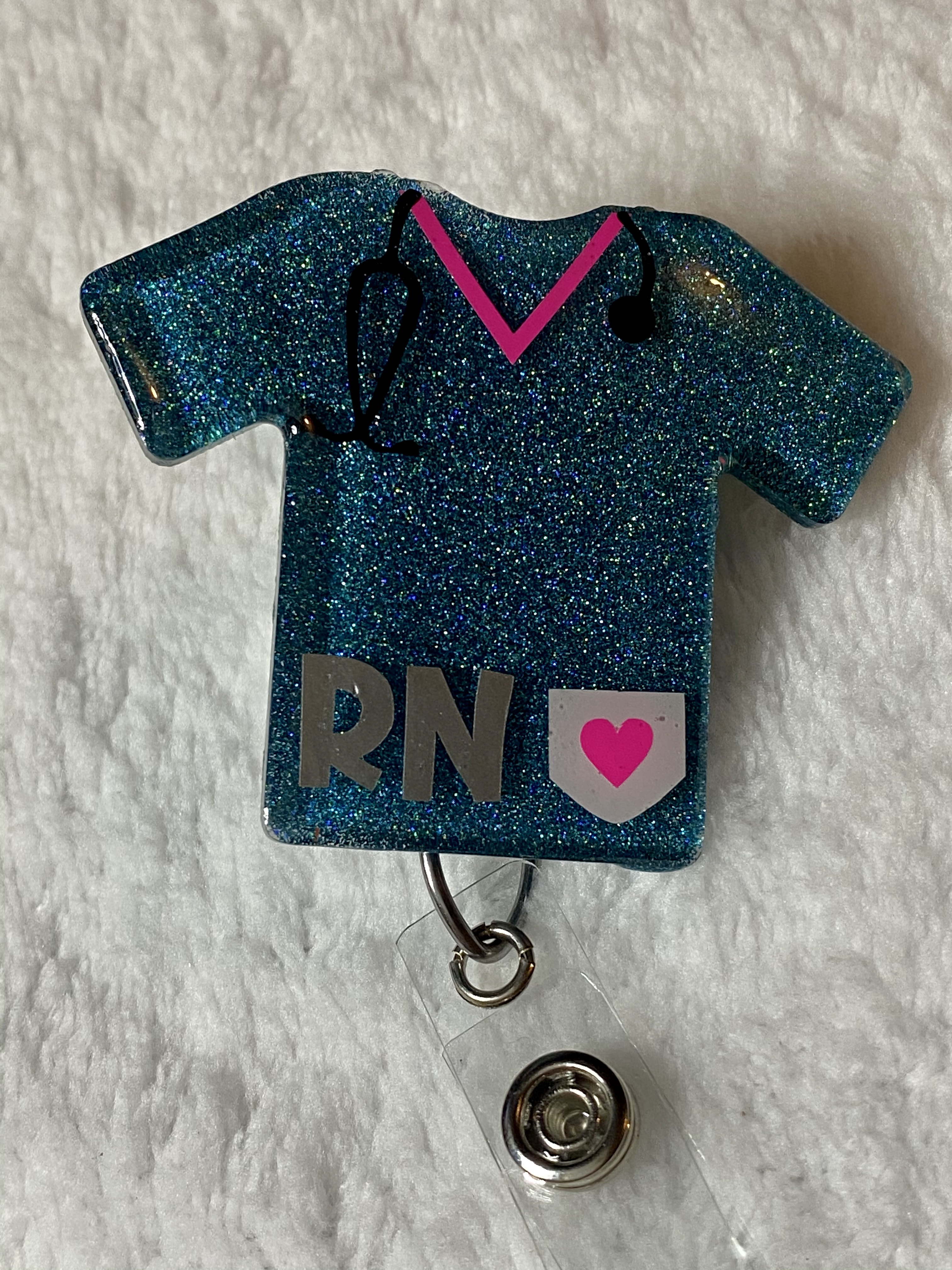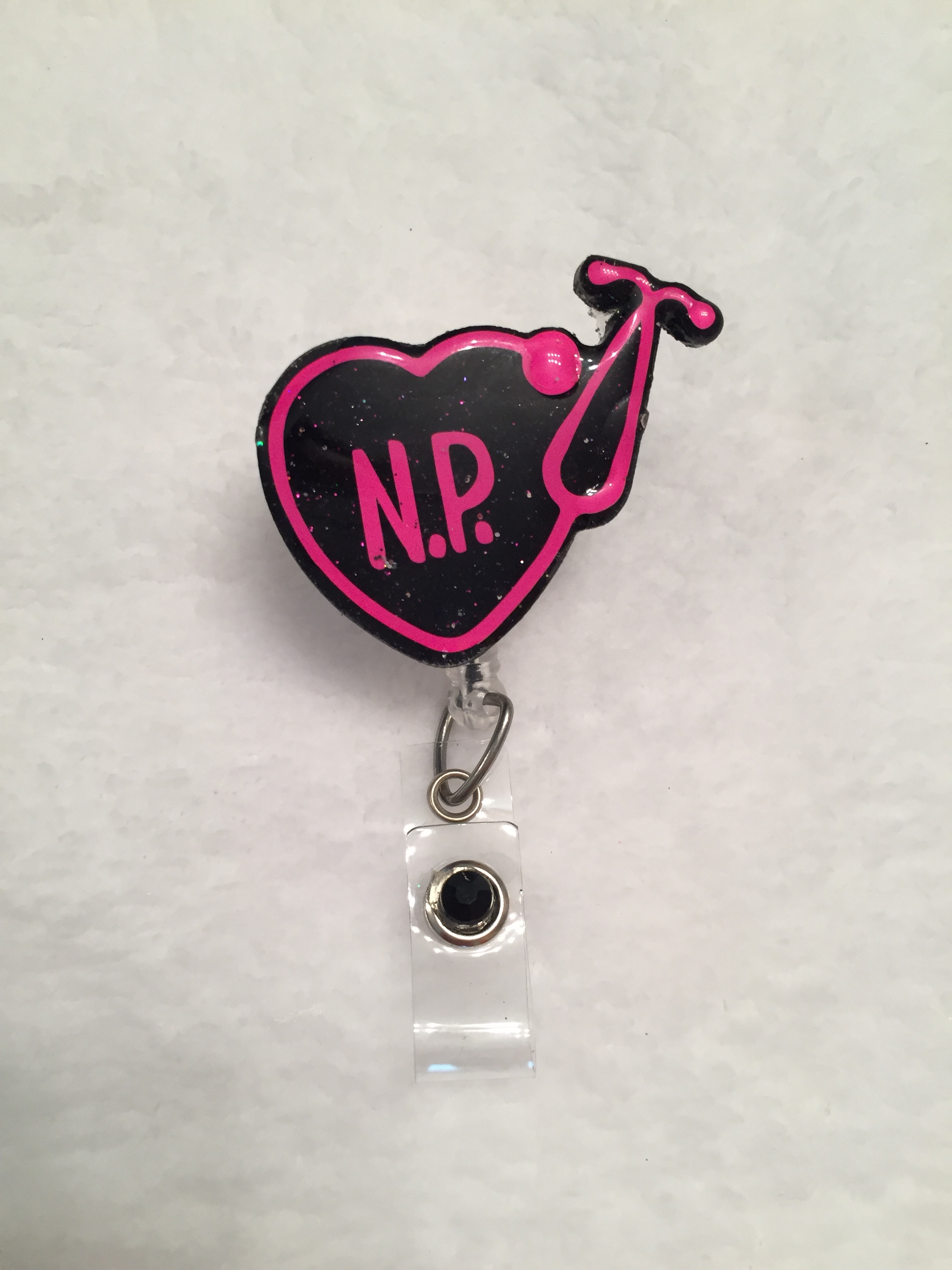 We offer all kinds of fun themes that includes holidays, sports, hobbies, and almost most medical fields. You can choose from many beautiful glitters or non glitter (powder) colors. The badge reels we use are the swivel retractable alligator clip reel and they are suppose to last up to 100,000+ pulls. You have the option to have them be interchangeable (with a low profile heavy duty Velcro) or to have them be permanently attached with E6000 adhesive to the reel.
