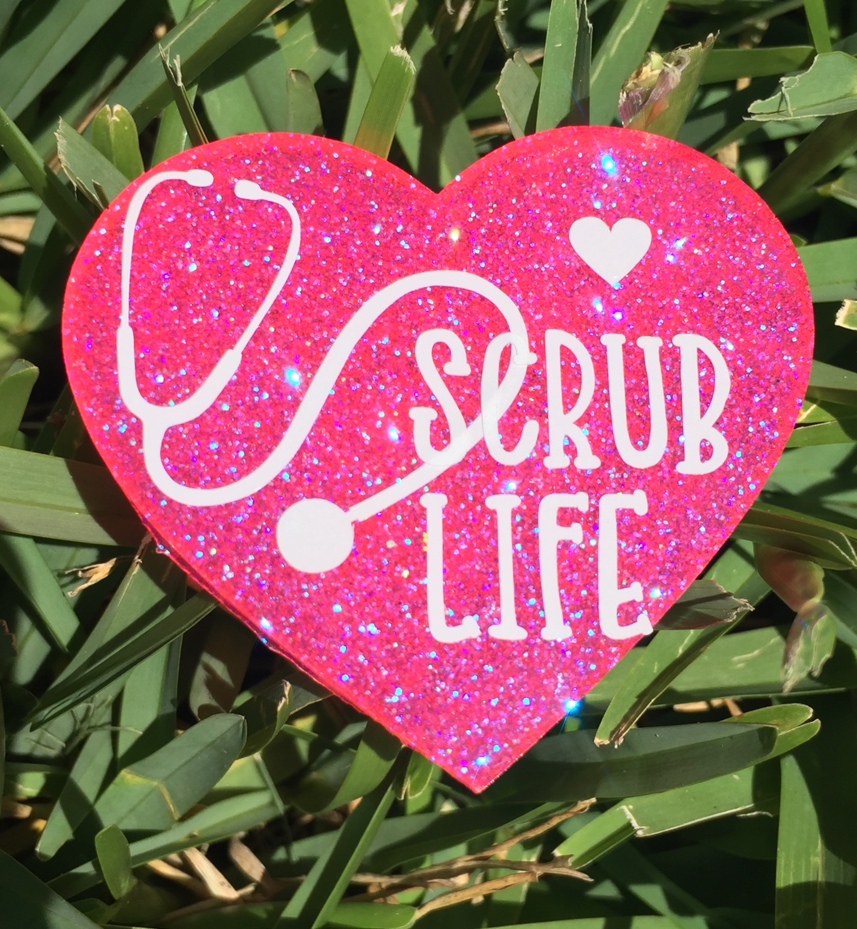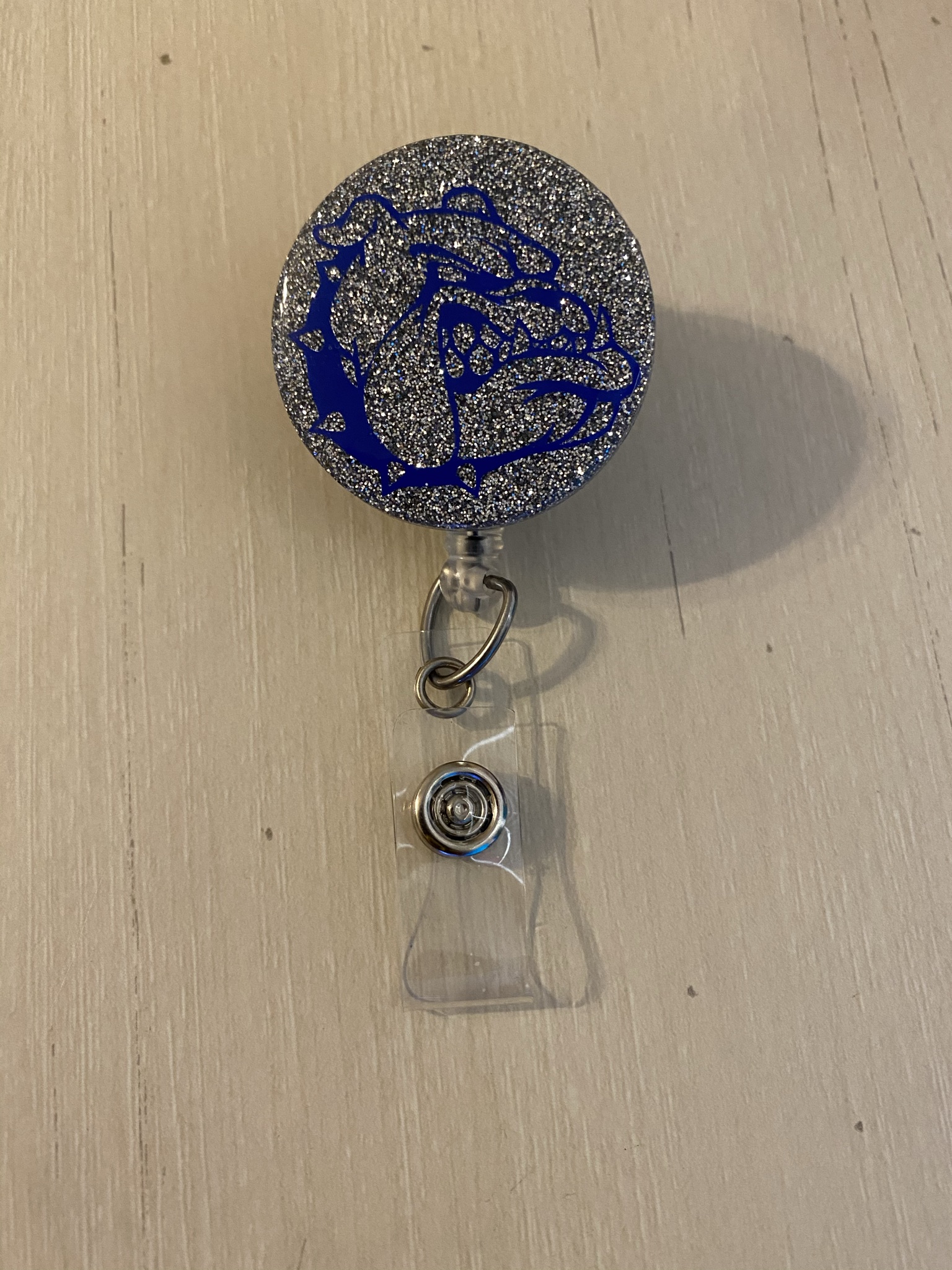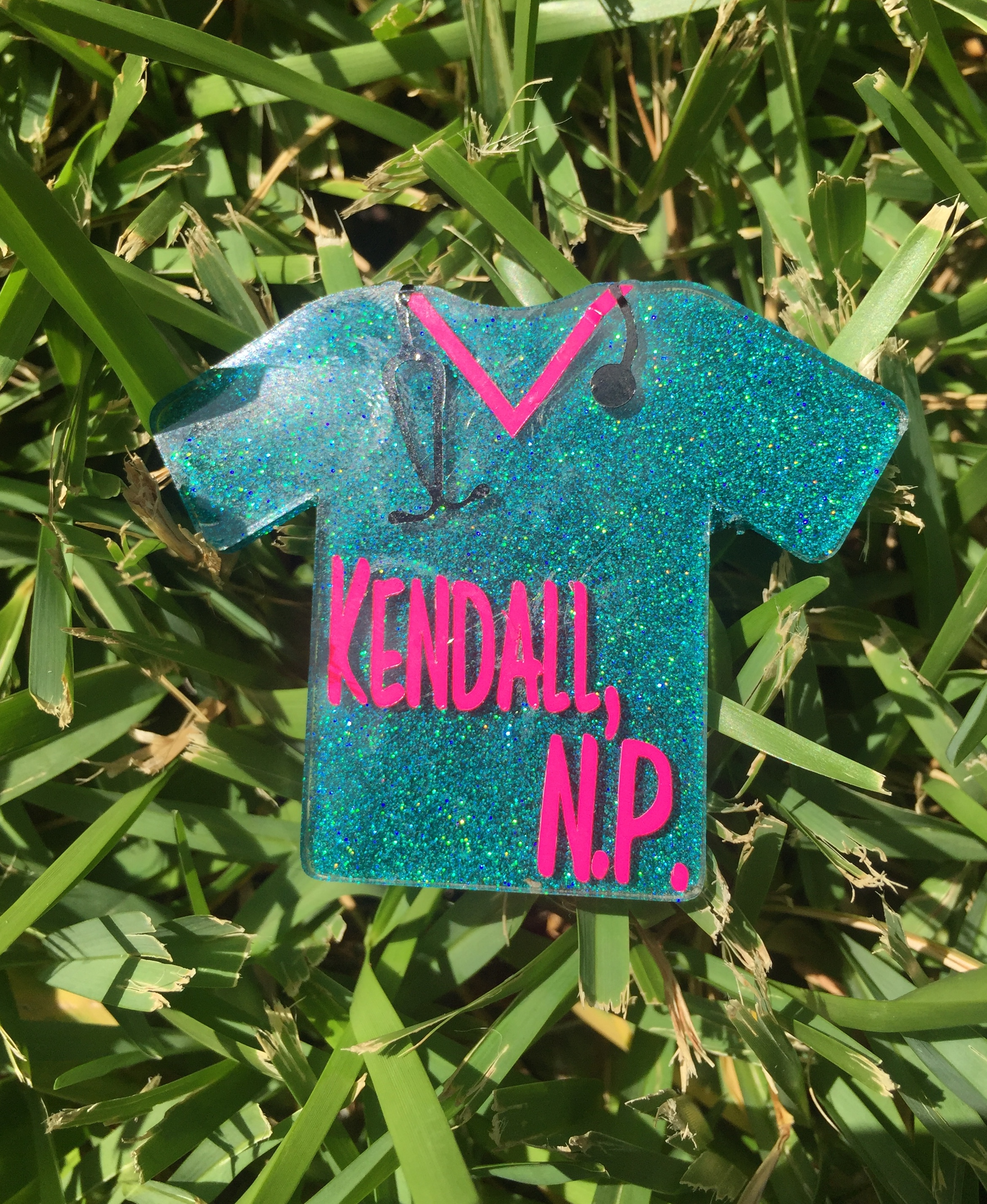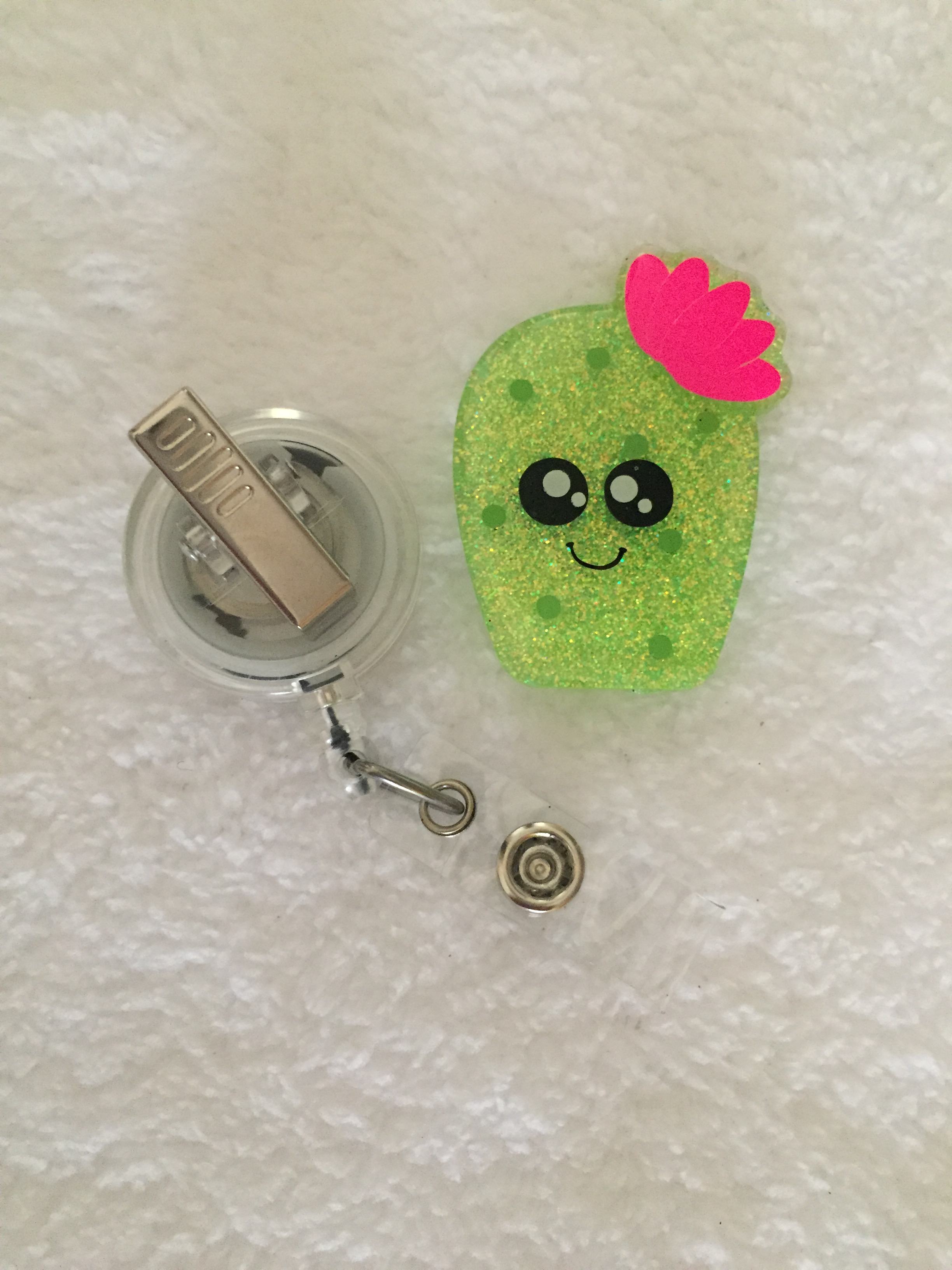 The badge holder is made of a 2″ high quality acrylic from Zindee, 651Oracal Permeant Vinyl from JPI Blanks, High Quality Polyester Glitter from Britches and Bows, UV resin from Amazon and they are durable and made to last.
